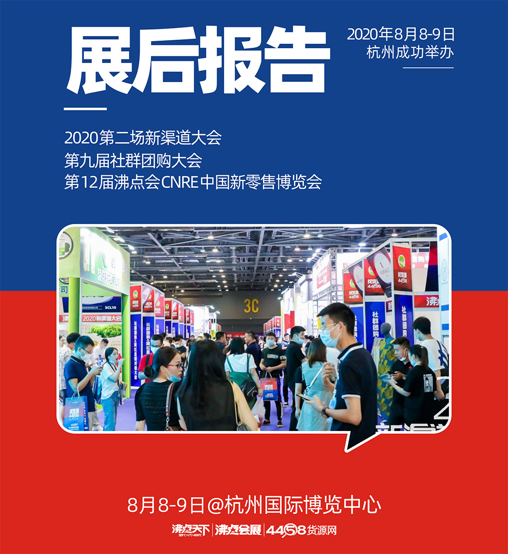 2020年第二屆新渠道大會、第九屆社群團購大會、第12屆沸點會CNRE新零售博覽會于8月8日-9日在杭州國際博覽中心召開,來自全國范圍的品牌方、供應鏈、平臺、新渠道創業者齊聚杭州,萬人匯聚共同探討新渠道,新機遇,新增長。