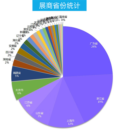 本次參展的企業(yè)中,廣東省,浙江省,上海市,山東省,江蘇是參展企業(yè)數(shù)量排名前五名的省市。