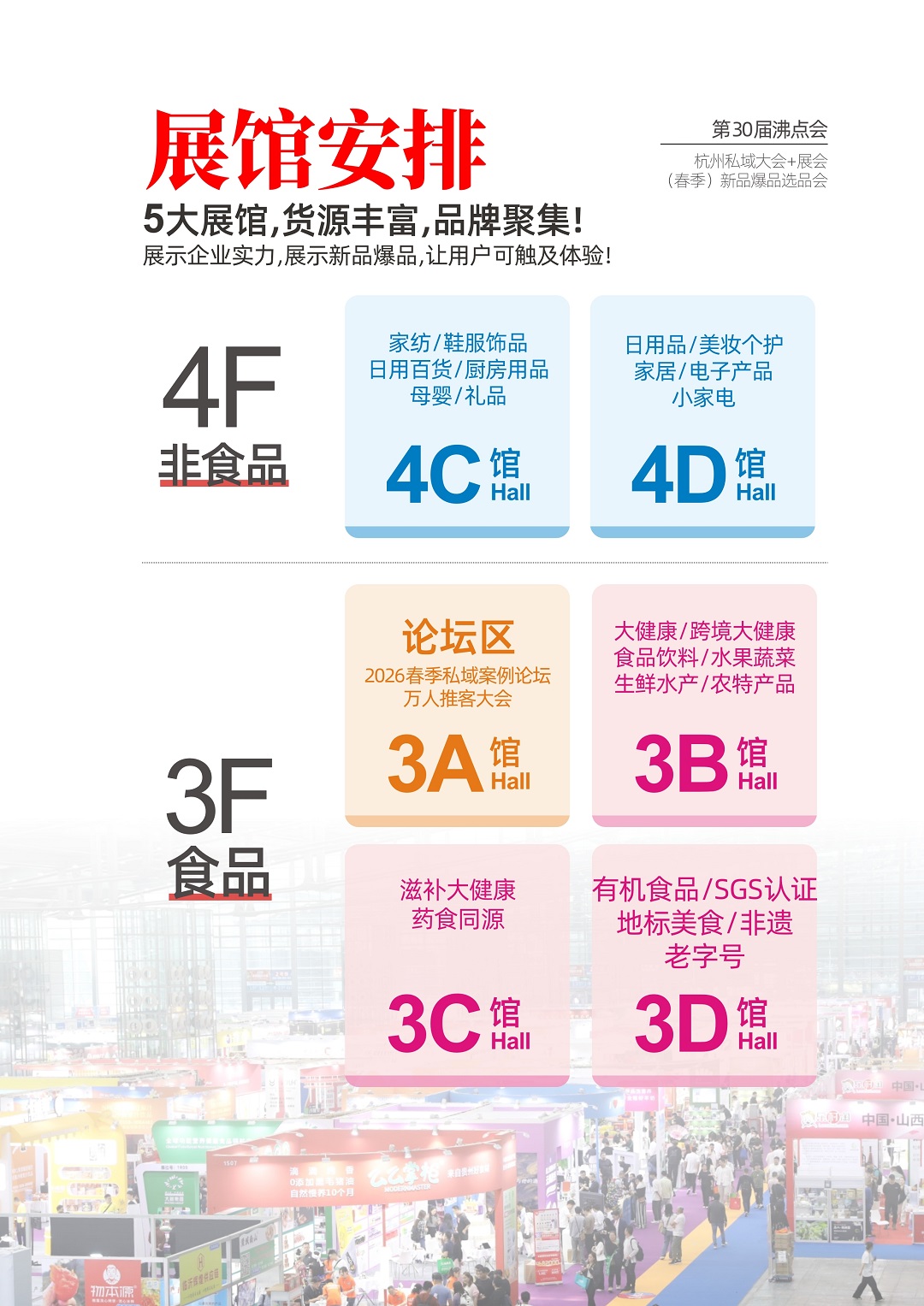 此次杭州沸點(diǎn)會,將啟用杭州國際博覽中心6大展館:3A/3B/3C/3D/4C/4D,總面積超5萬平米,1000+家優(yōu)質(zhì)參展商,10000+新品爆品展出,98%私域頭部渠道現(xiàn)場選品。