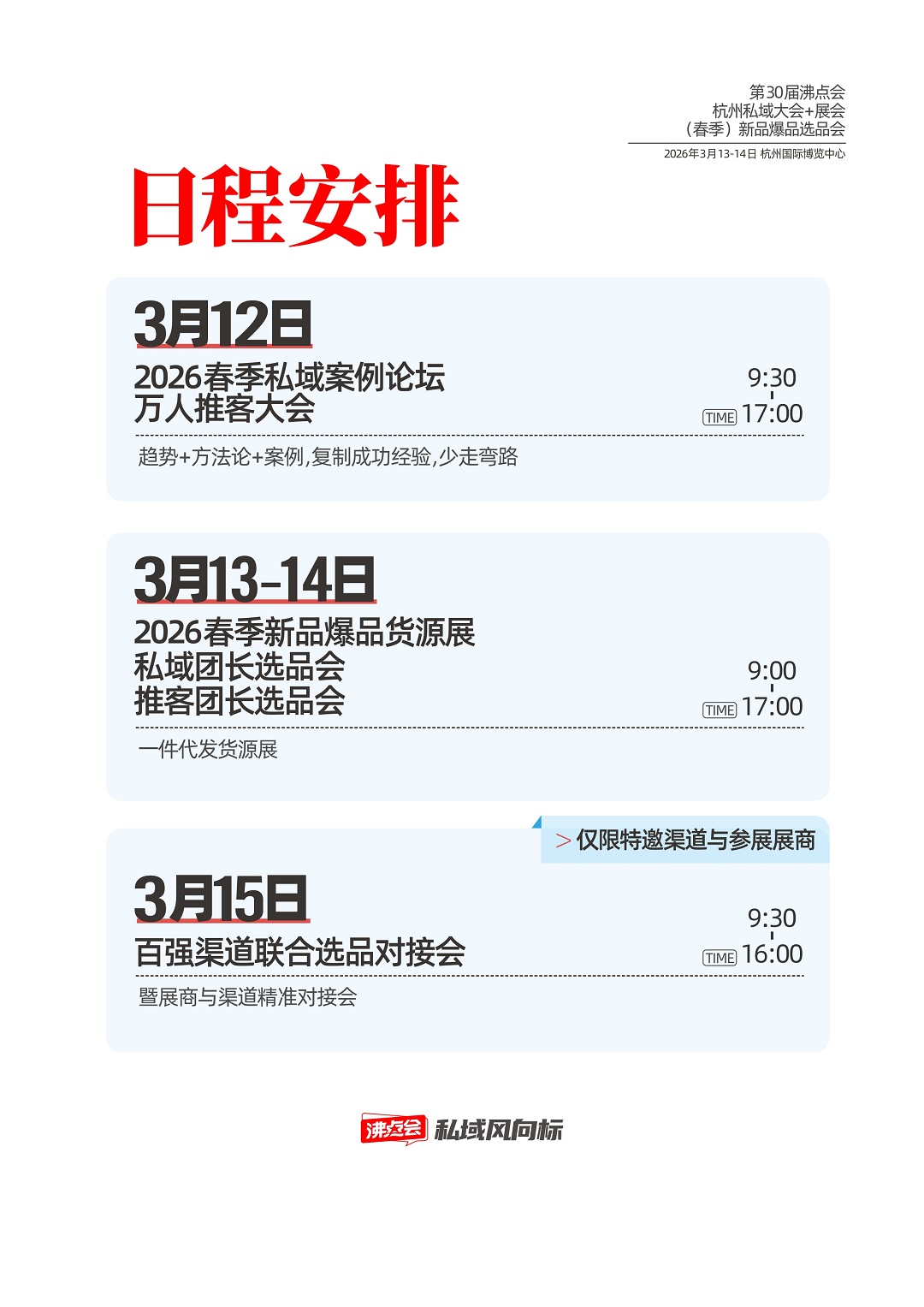 3月13-14日:2026春季新品爆品貨源展;1000+供貨商同臺展示產(chǎn)品,98%私域頭部渠道現(xiàn)場選品。